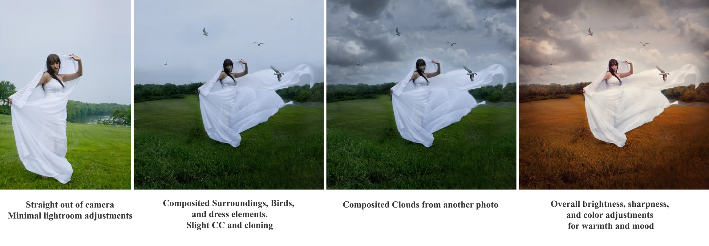 With this photo below, I composited approximately 10-12 photos. Each bird was from a separate photo I had taken, the clouds from one photo, four surrounding photos to fill in the landscape, and the dress from multiple shots tossing it in the air. Some of my outings include climbing or taking equipment close to water, thankfully there were no worries of that here. However, it had rained just a few minutes prior (note her wet hair). Sometimes unexpected things happen during these outings, and I just believe it makes it all the more interesting and inspires new ideas. Enjoy!